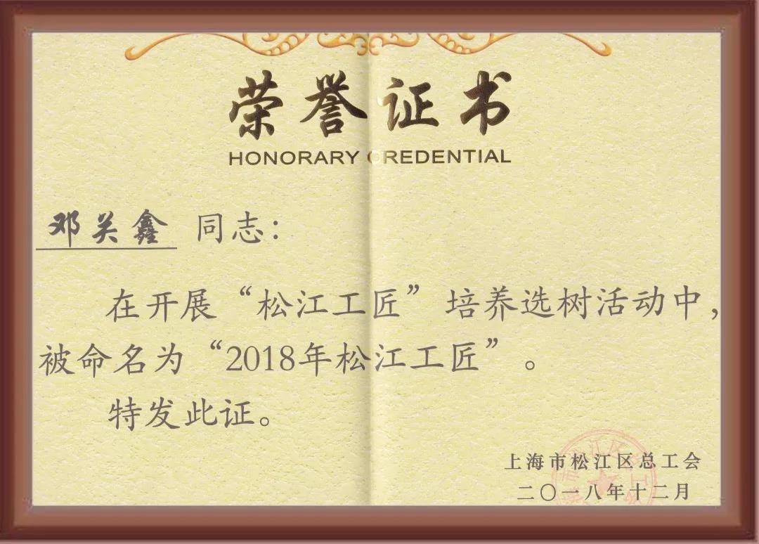 【熱烈祝賀】鄧關(guān)鑫榮獲首屆“松江工匠”榮譽(yù)稱號(hào)