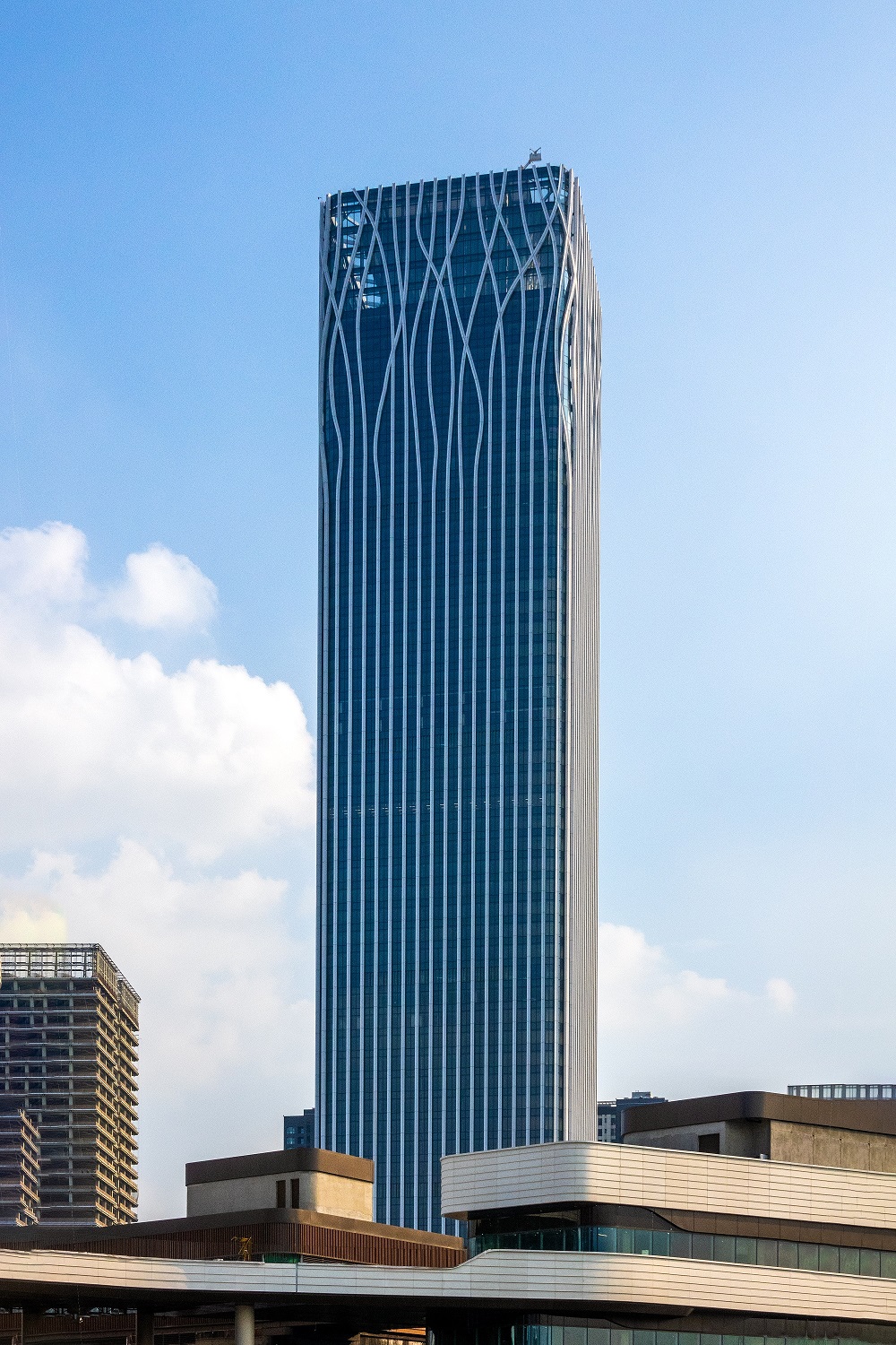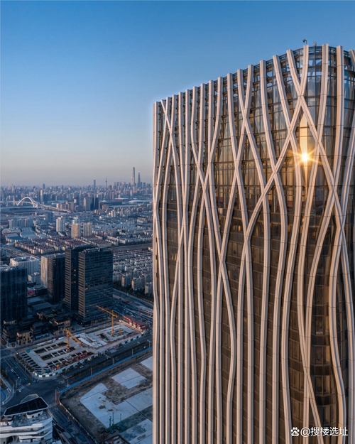 設(shè)計(jì)大師“樹”的設(shè)計(jì)理念突出體現(xiàn)在外立面幕墻。鋁幕線條從6層開始齊頭并進(jìn)直至215米處,之后線條開始不規(guī)則地“開枝散葉”,使得前灘中心看起來(lái)更為靈動(dòng)、生機(jī)勃勃。