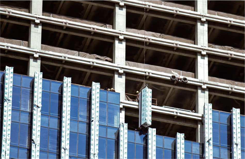 為追求水流的無(wú)序美感,塔樓頂端的鋁幕墻裝飾條均為不規(guī)則并伴有交叉的曲線。裝飾條轉(zhuǎn)角部位的鋁幕墻為工藝復(fù)雜雙曲面,項(xiàng)目中最大的一塊單元體線條,零部件數(shù)量超過(guò)100個(gè)單體,總面積達(dá)到19㎡,精度誤差要求不超過(guò)3mm,且安裝高度超過(guò)200米,制作和施工難度可想而知。