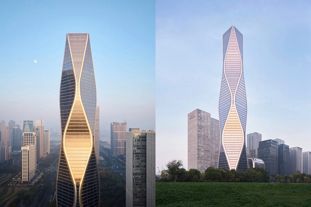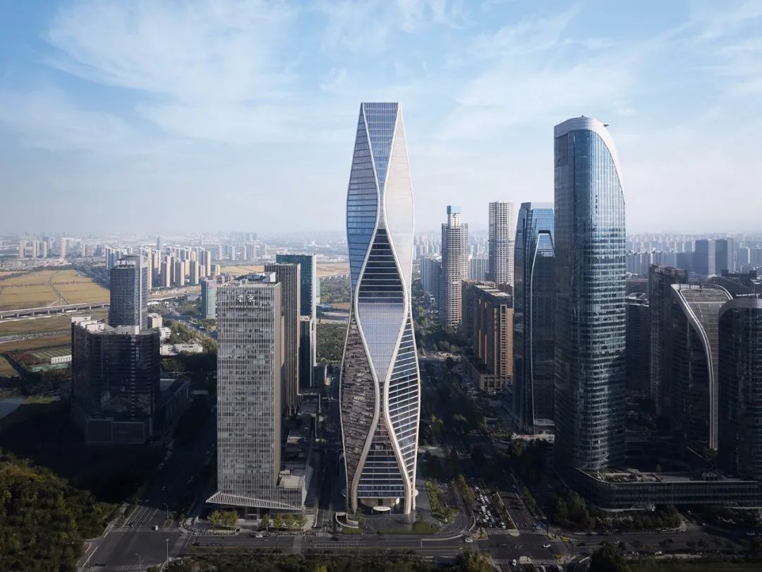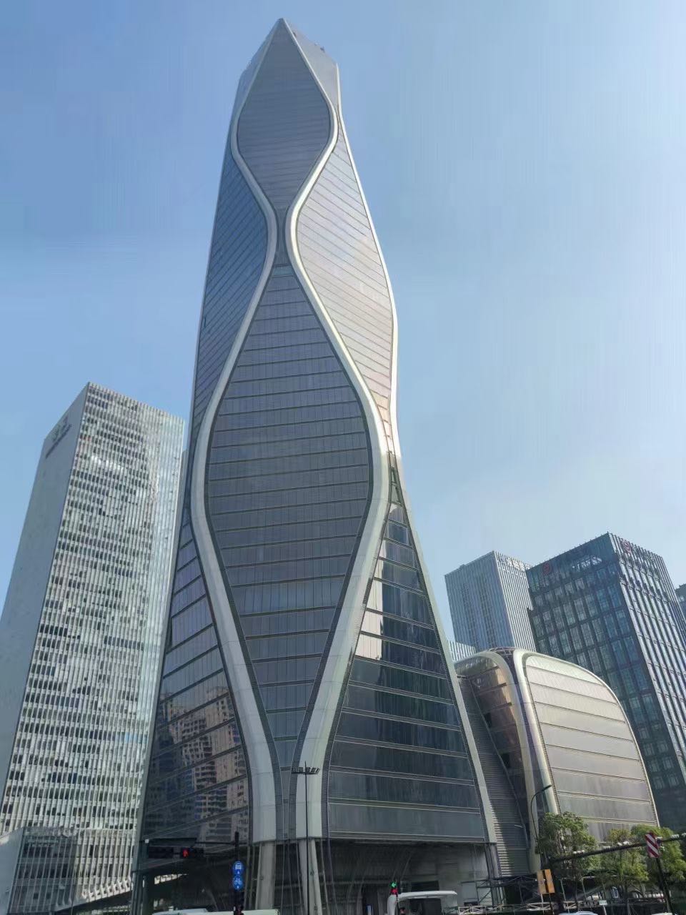 12.5 萬平方米的塔樓,造型獨(dú)特,沿著脈動的曲線向著云端升騰,讓人聯(lián)想到錢塘江漣漪的波紋。